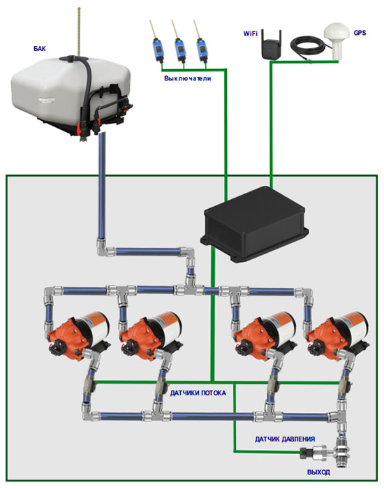 В базовой конфигурации используется один канал для внесения жидких удобрений. В систему может быть включено от одного до четырех насосов, которые работают на общий выходной коллектор. В качестве датчика скорости используется GPS приемник. Так же присутствует один концевой выключатель (можно подключить 2 дополнительных).