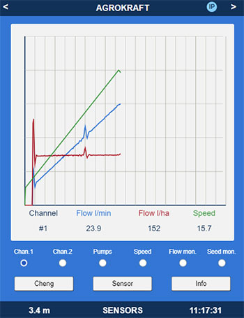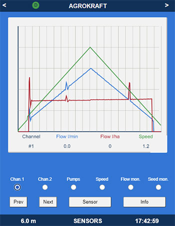 Опция Seeding monitor, позволяет подключить к системе потоковые датчики контроля высева на каждый рабочего органа и контролировать их работоспособность для каждого ряда. На экран выводится информация о текущих расходах в виде диаграммы и при отклонении происходит останов вылива с указанием проблемного рабочего органа. Диапазон отклонений для срабатывания ошибки задается в настройках. Всего доступно до 96 каналов мониторинга жидких удобрений и до 96 каналов контроля высева.