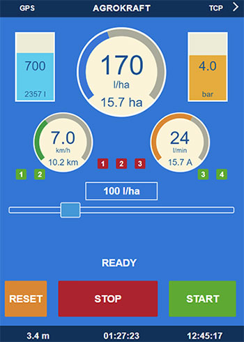 Изображение может немного отличатся, в зависимости от конфигурации конкретной системы (количества насосов и количество используемых концевых выключателей) и выдавать сообщение: “READY” или “NOT READY”. Мигающий индикатор TCP говорит об подключении планшета к контроллеру и обмене информацией. Постоянно горящий сигнал GPS информирует о приеме достоверных сигналов со спутника и готовности датчика скорости GPS к работе. В зависимости от конкретной ситуации со спутниковой конфигурацией в месте наблюдения, сигнал появляется с задержкой до 5 минут. До появления этого сигнала работа контроллера в автоматическом режиме невозможна. Можно использовать систему только в “Ручном режиме”, который будет описан далее.