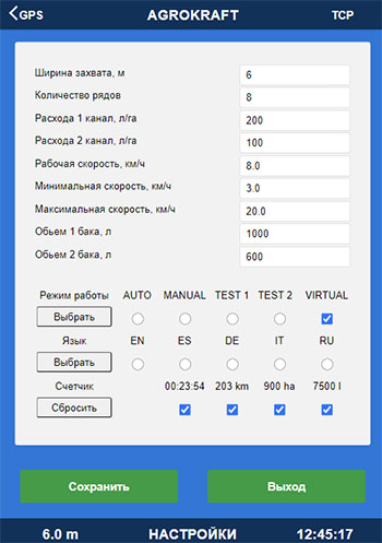 Кнопка “Сбросить” позволяет сбросить счетчики времени работы насосов, общего пробега, обработанной площади и суммарного расхода удобрения.