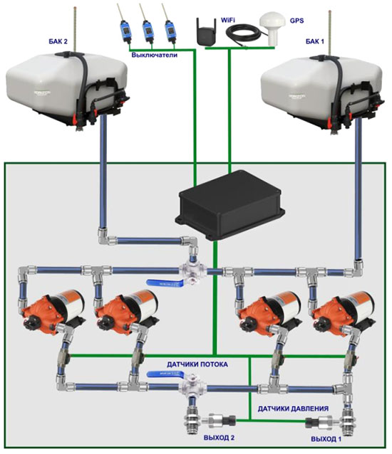 В этой конфигурации используется два канала для внесения жидких удобрений. Насосы, установленные в системе, разделены на 2 группы (до двух насосов в каждой) и эти группы соединены T образным вентилем по входным и выходным патрубкам. Такое подключение позволяет гибко конфигурировать систему для различных задач. Можно иметь два независимых канала один для удобрений второй для гербицидов. Можно оба входных бака объединить, но вылив производить по двум независимым магистралям – междурядной и прикорневой с разными расходами. Можно объединить и входы, и выходы и превратить в одноканальную систему с высокой производительностью. Так же можно один канал использовать для внесения удобрений, а второй для перекачки жидкости из переднего подвесного бака в задний основной, тем самым сохраняя развесовку трактора. Систему можно комбинировать количеством включенных насосов по принципу 1+1, 2+1 или 2+2, в зависимости от стоящих задач. В качестве датчика скорости используется GPS приемник. Так же присутствует один концевой выключатель (можно подключить 2 дополнительных). Структурная схема приведена на рисунке.