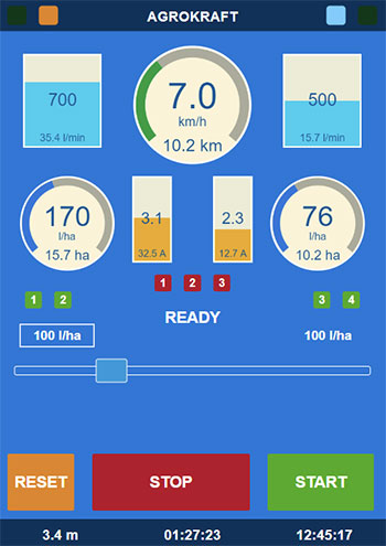 Оператор с помощью пульта задает необходимые нормы расхода, будь то жидкие или сухие удобрения, семена и т.д. и вводит номинальную рабочую скорость.
