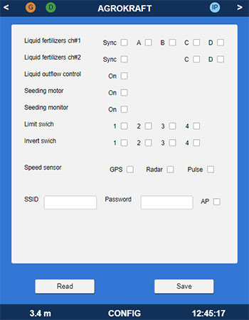 Контроллер позволяет, с учетом скорости движения трактора, управлять и контролировать дозирование вносимых удобрений. Контроллер имеет четыре независимых канала управления насосами, которые могут быть настроены на различные режимы работы в зависимости от выбранных конфигураций. Управление, конфигурирование, настройка и тестирование производится через беспроводную сеть WIFI при помощи любого устройства (компьютер, планшет, телефон) подключенного к этой сети при помощи WEB интерфейса. В качестве датчика скорости может использоваться GPS приемник, допплеровский радар или импульсный датчик от измерительного колеса. Возможна одновременная работа этих датчиков с системой приоритетного резервирования. Так же может быть подключена многоканальная (до 64 каналов) система контроля вылива жидких удобрений и система контроля внесения сухих удобрений или семян. К каждому каналу контроллера может быть подключен насос для подачи жидких удобрений мощностью до 360 Вт (30 А). Если подключаемый насос имеет большую мощность, то каналы можно объединить и таким образом управлять насосом до 1200Вт (100А). Базовый вариант предполагает использование мембранных насосов с мощностью 250Вт (до четырех насосов) и объединять их по выходным патрубкам. Такая конфигурация позволяет перекрыть широкий диапазон расходов, а автоматика контроллера включает необходимое количество насосов для достижения заданной производительности. Система измеряет для каждого насоса его расход и потребляемый ток и при отклонениях или аварийных ситуациях отключает насосы. Так же контролируется давление на выходе и предусмотрена защита от отклонения давления. Все параметры защиты могут настраивается индивидуально для каждого канала.