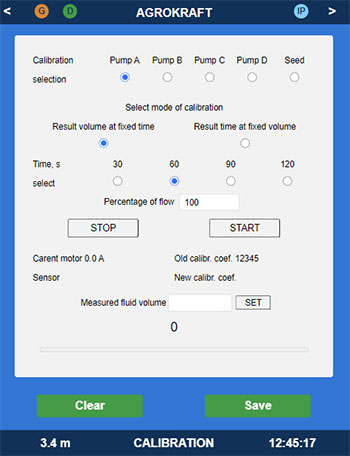Калибровка сенсоров является важной процедурой, которая позволяет точно выполнить рекомендации по внесению удобрений. Производительность насосов и сенсоров сильно зависит от вязкости жидкости, а вязкость определяется многими параметрами: составом, концентрацией, температурой среды и т.д. Мы имеем отдельную WEB страницу, посвященную калибровке.